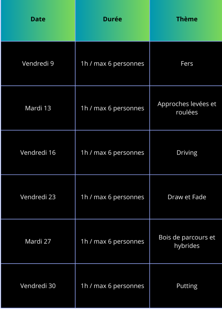 Au programme : de la technique, de la stratégie et du mental bien sûr mais sur la base de jeux afin de rendre le golf plus ludique et apprendre en s’amusant.