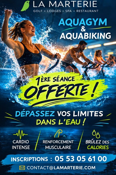 L’Aquabiking se pratique sur un vélo fixe, immergé dans l’eau dans une piscine adaptée de 1m40 de profondeur et chauffée à 30°C.